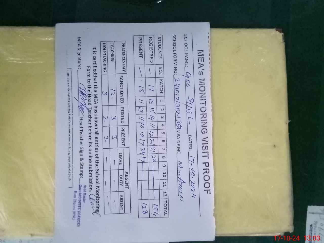 | Attendance Register | Head Teacher | MEA with School | Visit Proof |