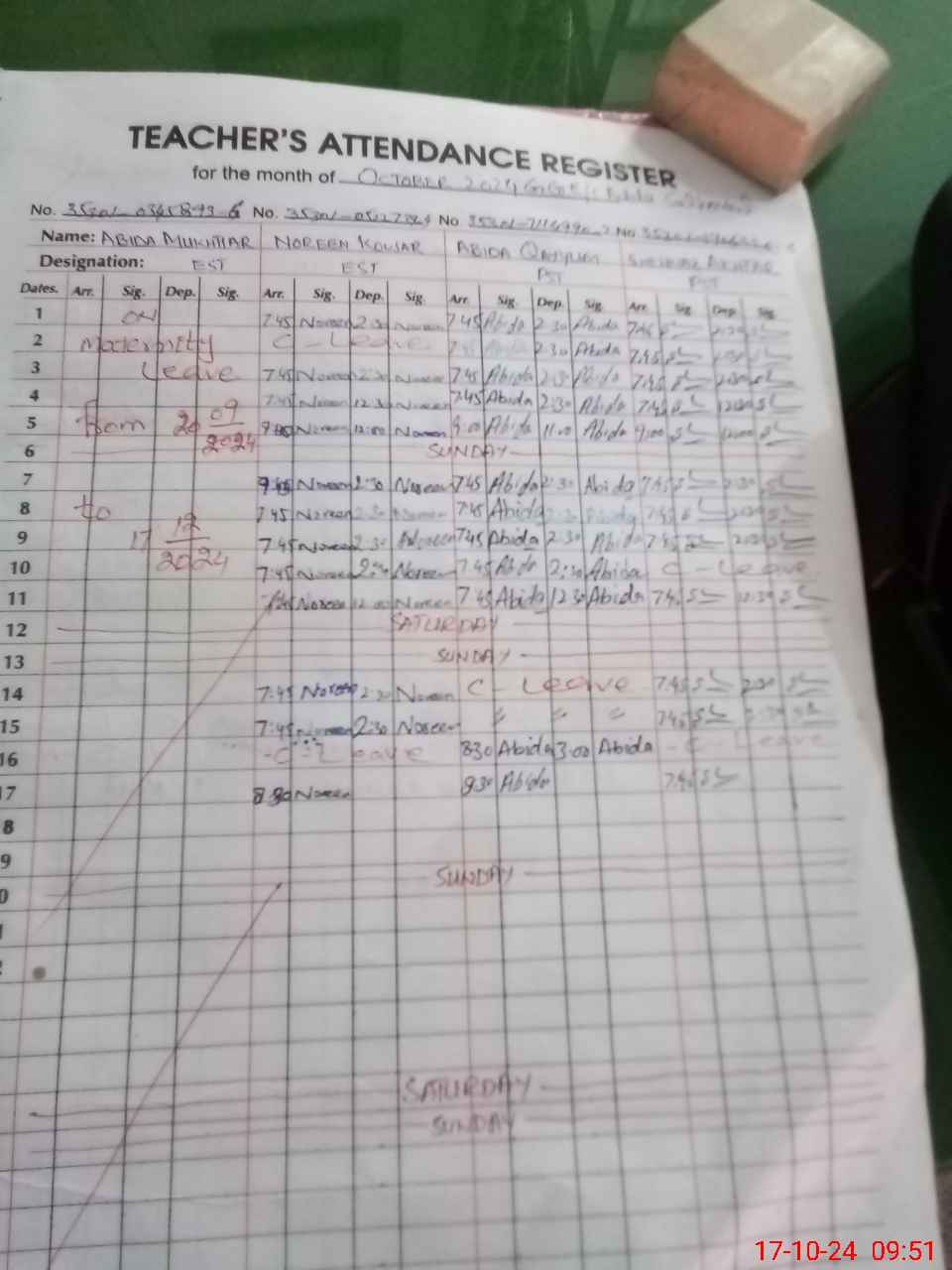 | 35**** | Ab**** Mu**** Ah**** | Regular | 11 | 0 | 0 | 11 | 0 | 0 | 0 | 0 | 0 | Maternity | |