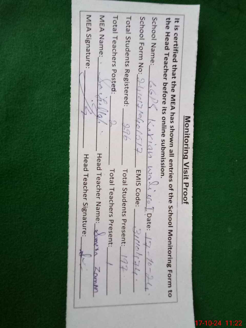 | Attendance Register | Head Teacher | MEA with School | Visit Proof |