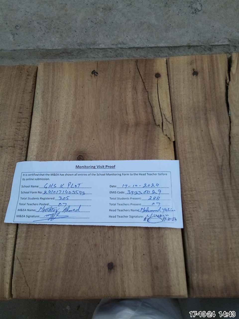 | Attendance Register | Head Teacher | MEA with School | Visit Proof |