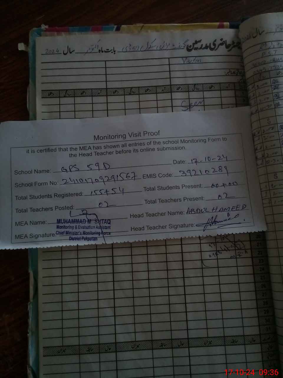 | Attendance Register | Head Teacher | MEA with School | Visit Proof |