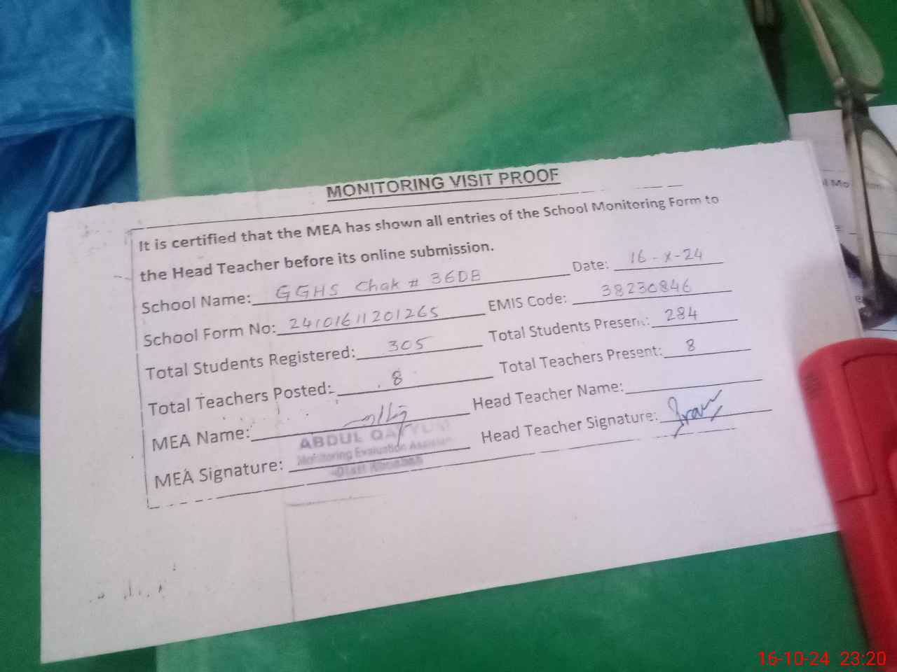 | EMIS Code: 38230846 | Name of School: GGHS CHAK NO 36 DB | |||