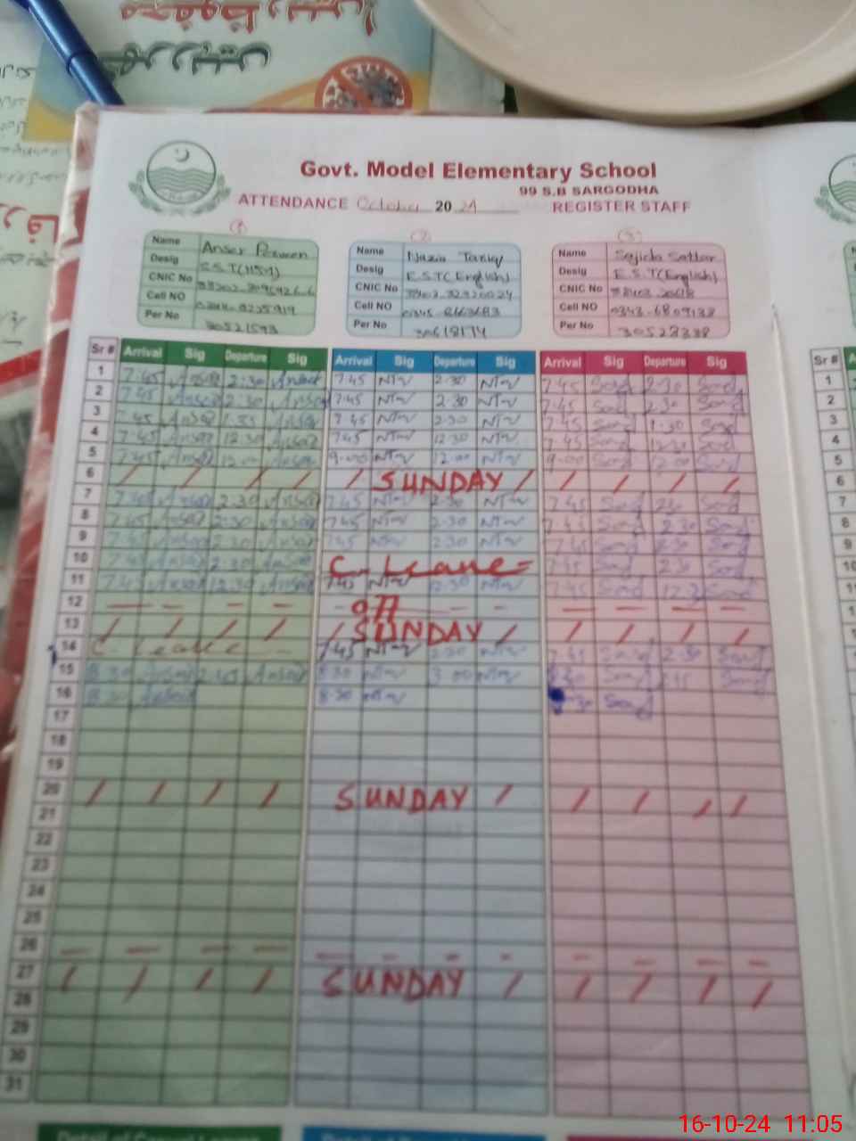 | CNIC | Full Name | Designation | R/C | Absence during last cal. month |