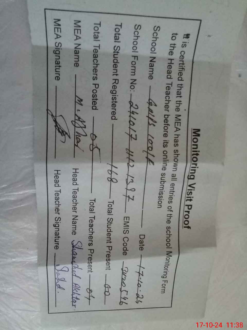 | Certified that this School was Inspected by the Undersigned MEA/DMO Today and the Information Stated Above is as Per Record. | |||||