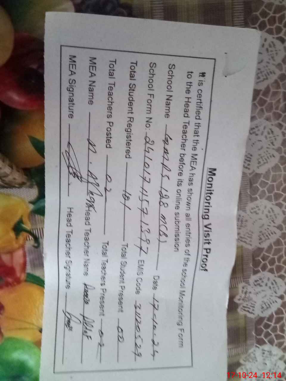 | Attendance Register | Head Teacher | MEA with School | Visit Proof |