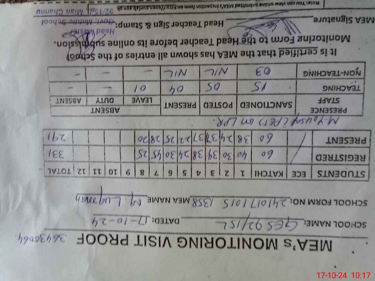 | Attendance Register | Head Teacher | MEA with School | Visit Proof |