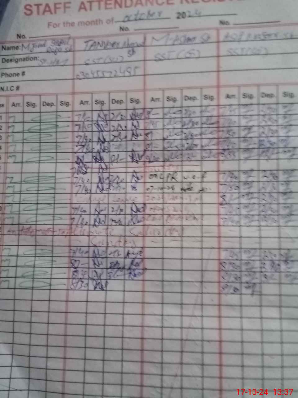 | CNIC | Full Name | Designation | R/C | Absence during last cal. month |