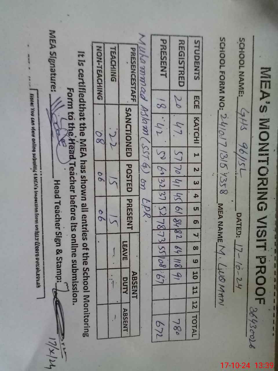| Certified that this School was Inspected by the Undersigned MEA/DMO Today and the Information Stated Above is as Per Record. | |||||