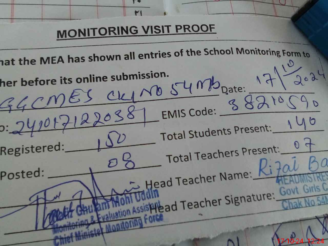 | EMIS Code: 38210590 | Name of School: GGCMES CHAK NO. 54/MB | |||