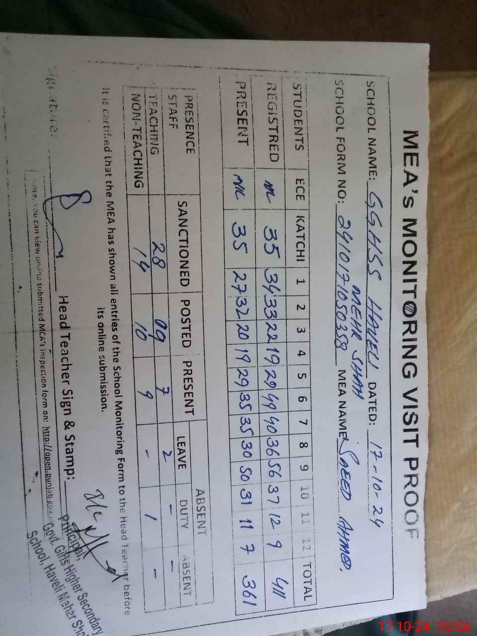 | Attendance Register | Head Teacher | MEA with School | Visit Proof |