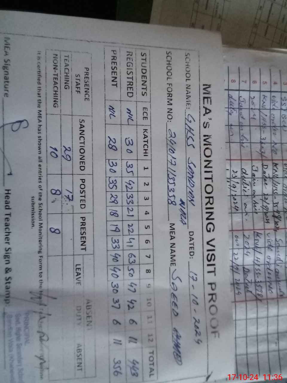 | Attendance Register | Head Teacher | MEA with School | Visit Proof |
