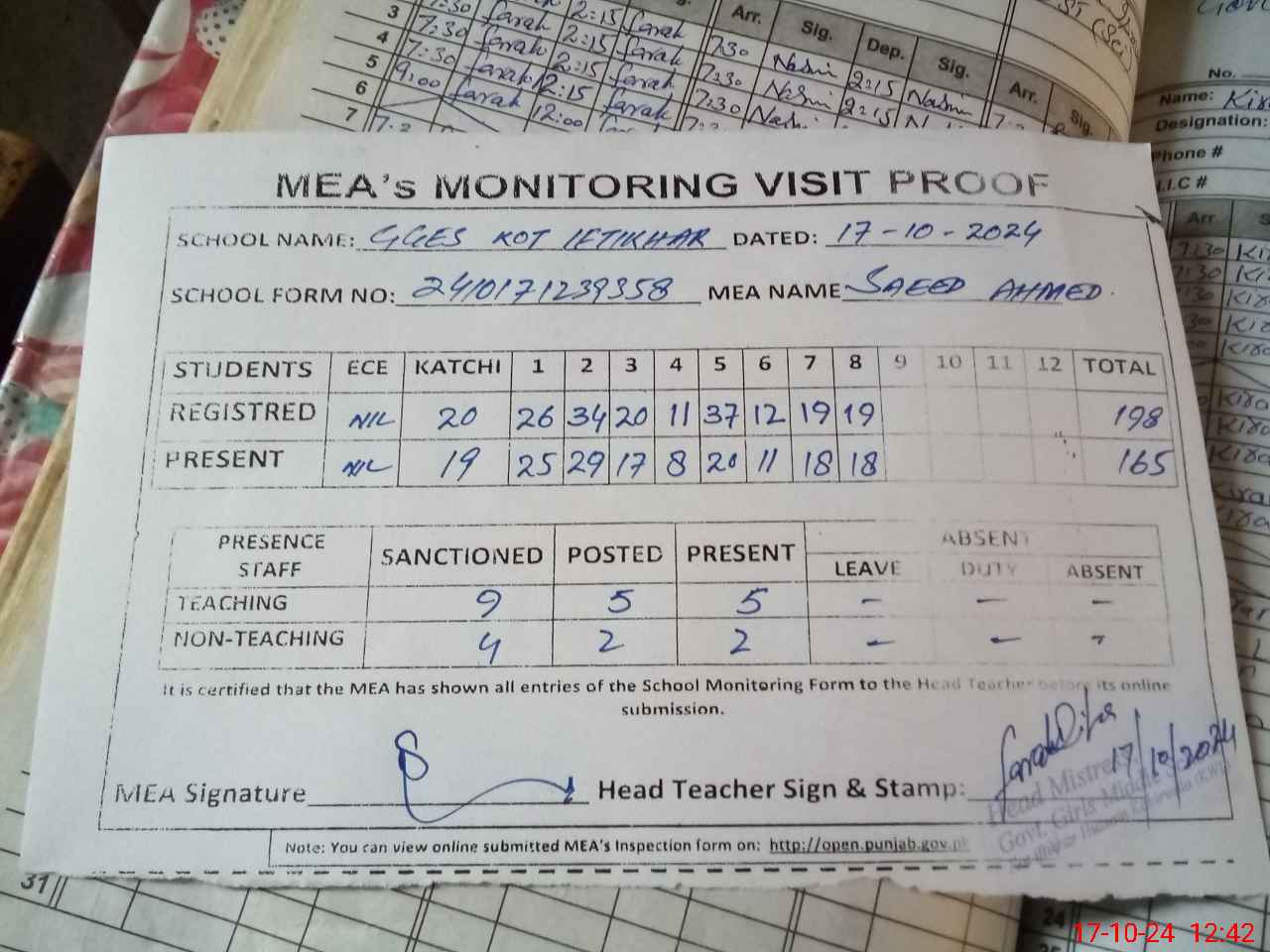 | Attendance Register | Head Teacher | MEA with School | Visit Proof |