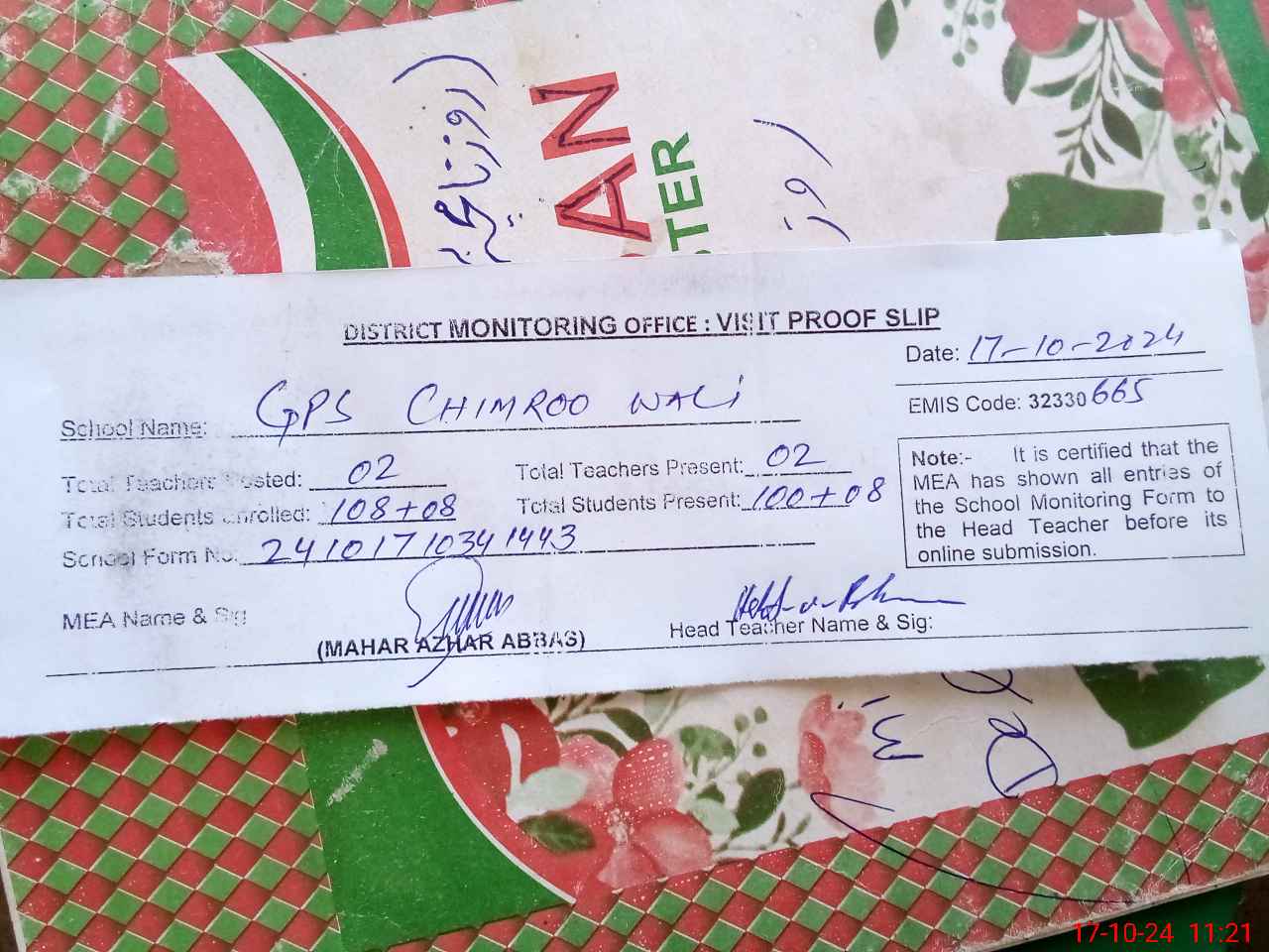 | Attendance Register | Head Teacher | MEA with School | Visit Proof |