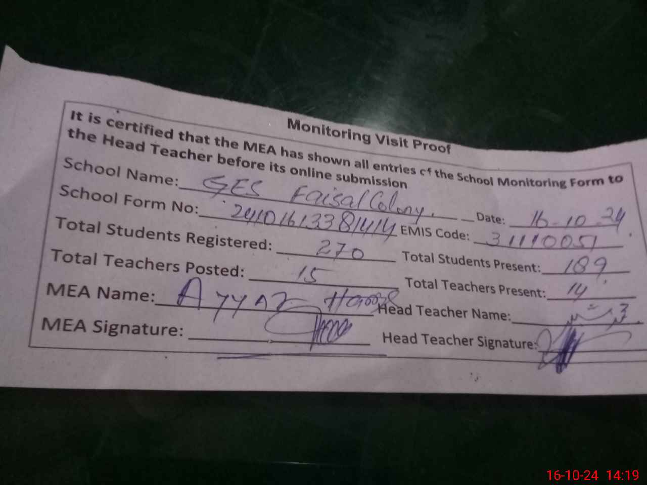 | EMIS Code: 31110051 | Name of School: GES FAISAL COLONY | |||