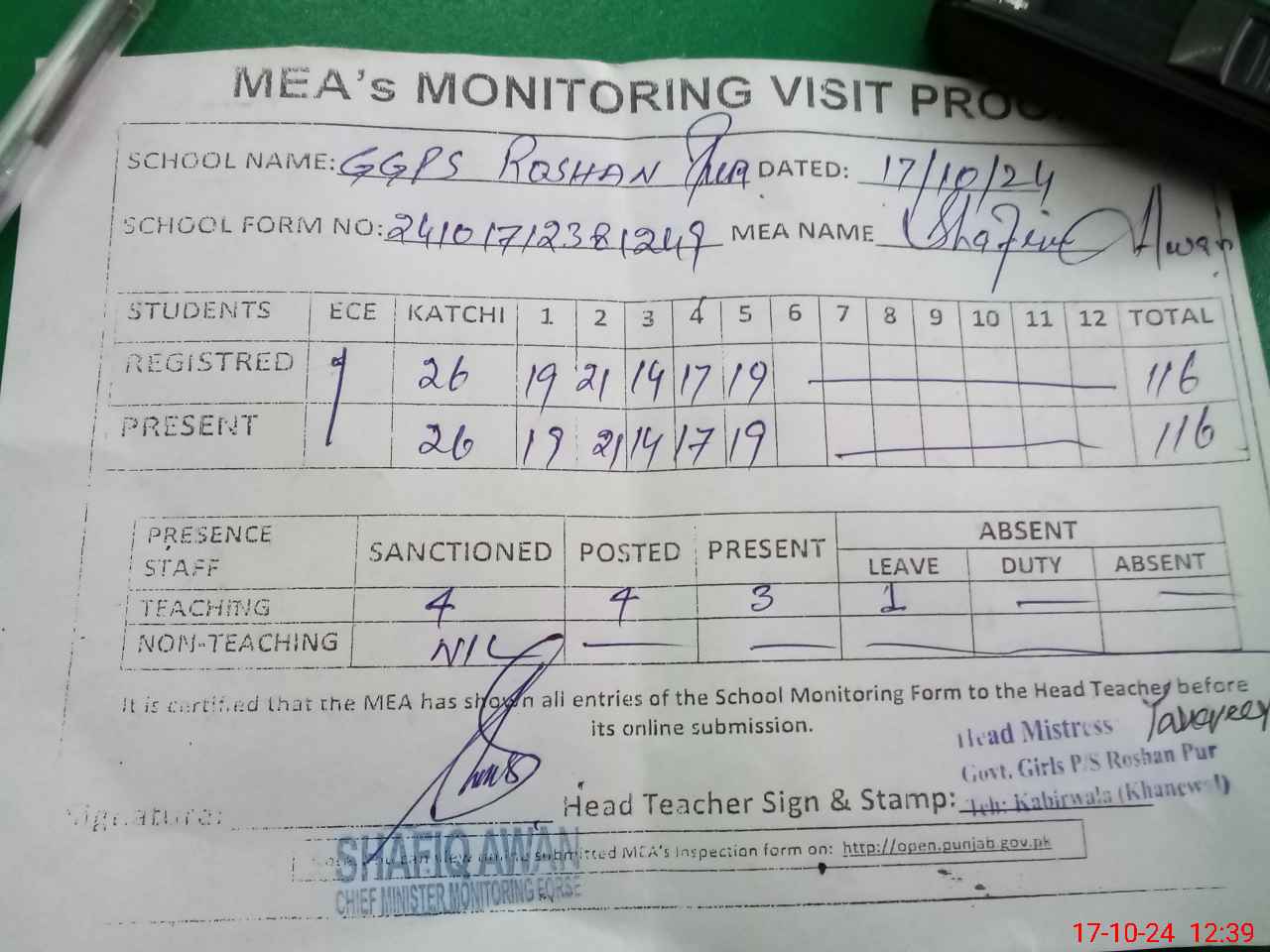 | EMIS Code: 36410462 | Name of School: GGPS ROSHAN PUR, ABDUL HAKIM | |||