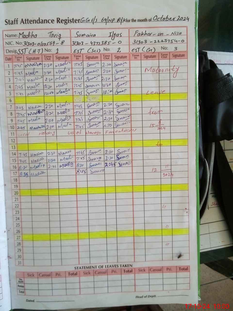 | CNIC | Full Name | Designation | R/C | Absence During Last Calender Month |