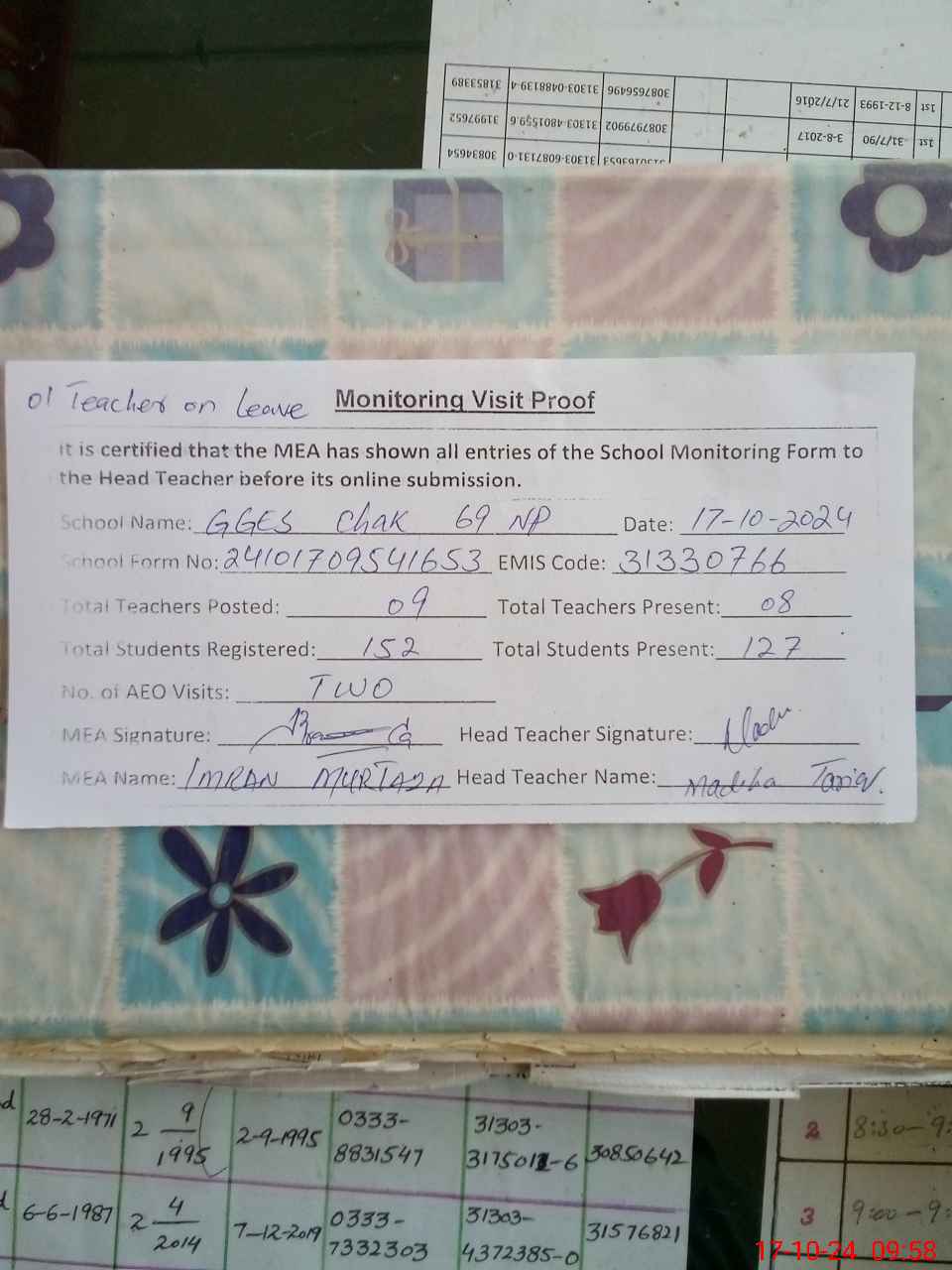 | Attendance Register | Head Teacher | MEA with School | Visit Proof |