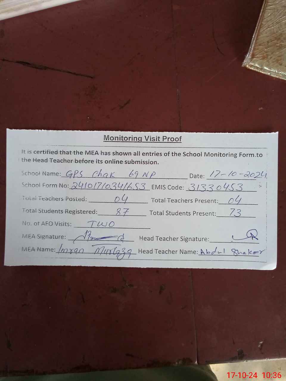| Attendance Register | Head Teacher | MEA with School | Visit Proof |