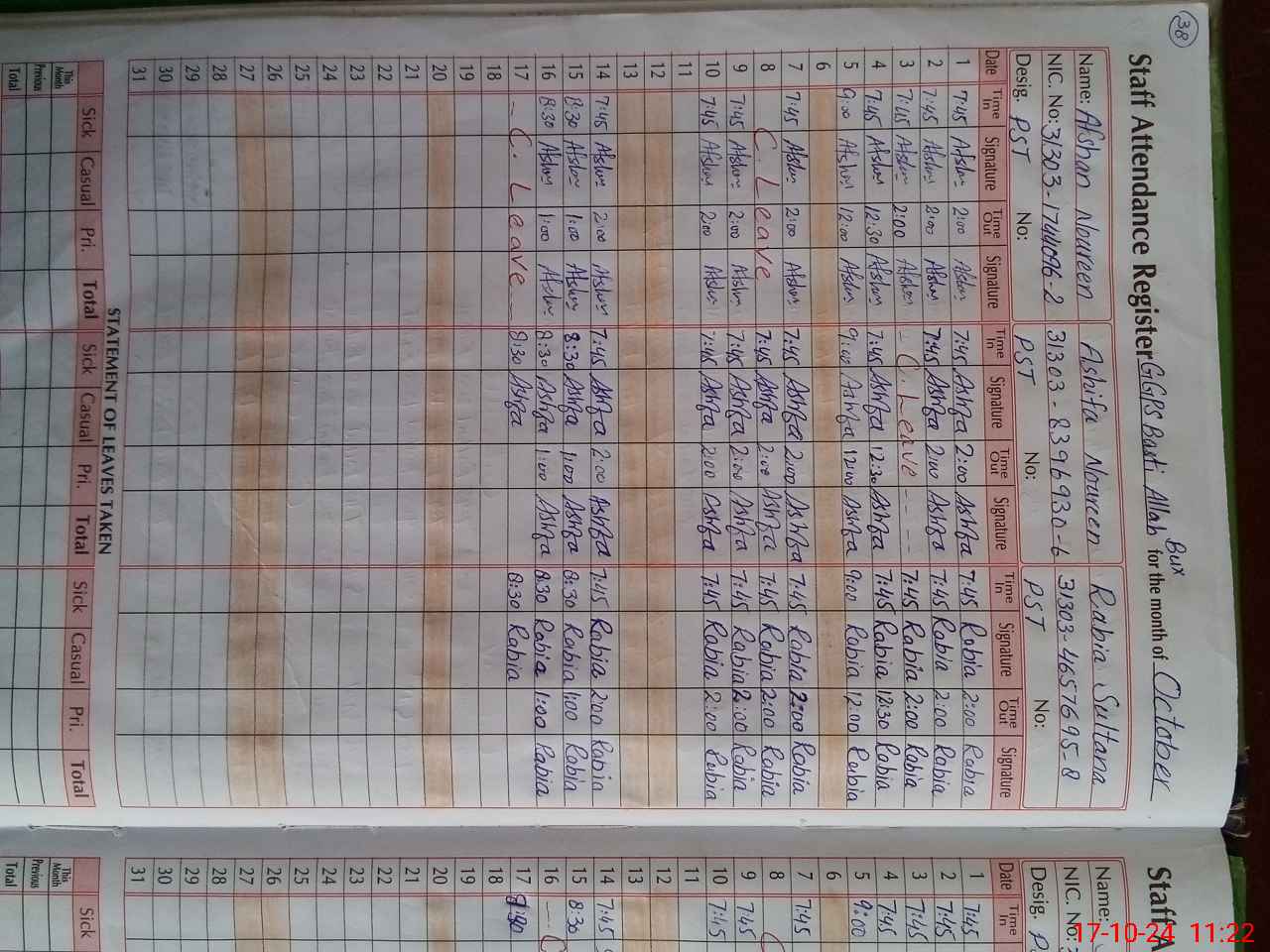 | CNIC | Full Name | Designation | R/C | Absence During Last Calender Month |