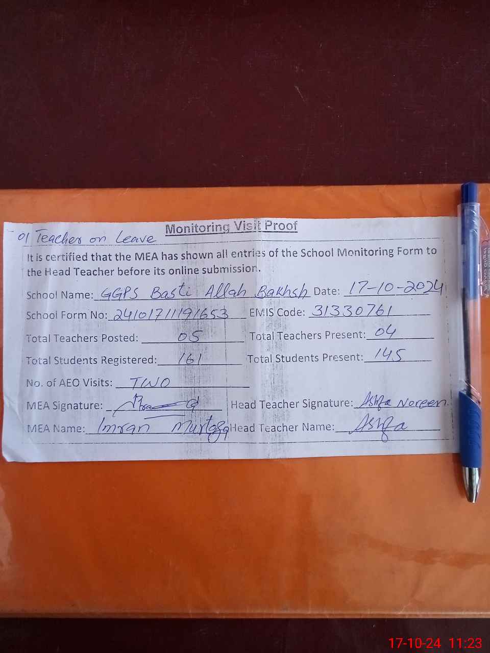 | Attendance Register | Head Teacher | MEA with School | Visit Proof |