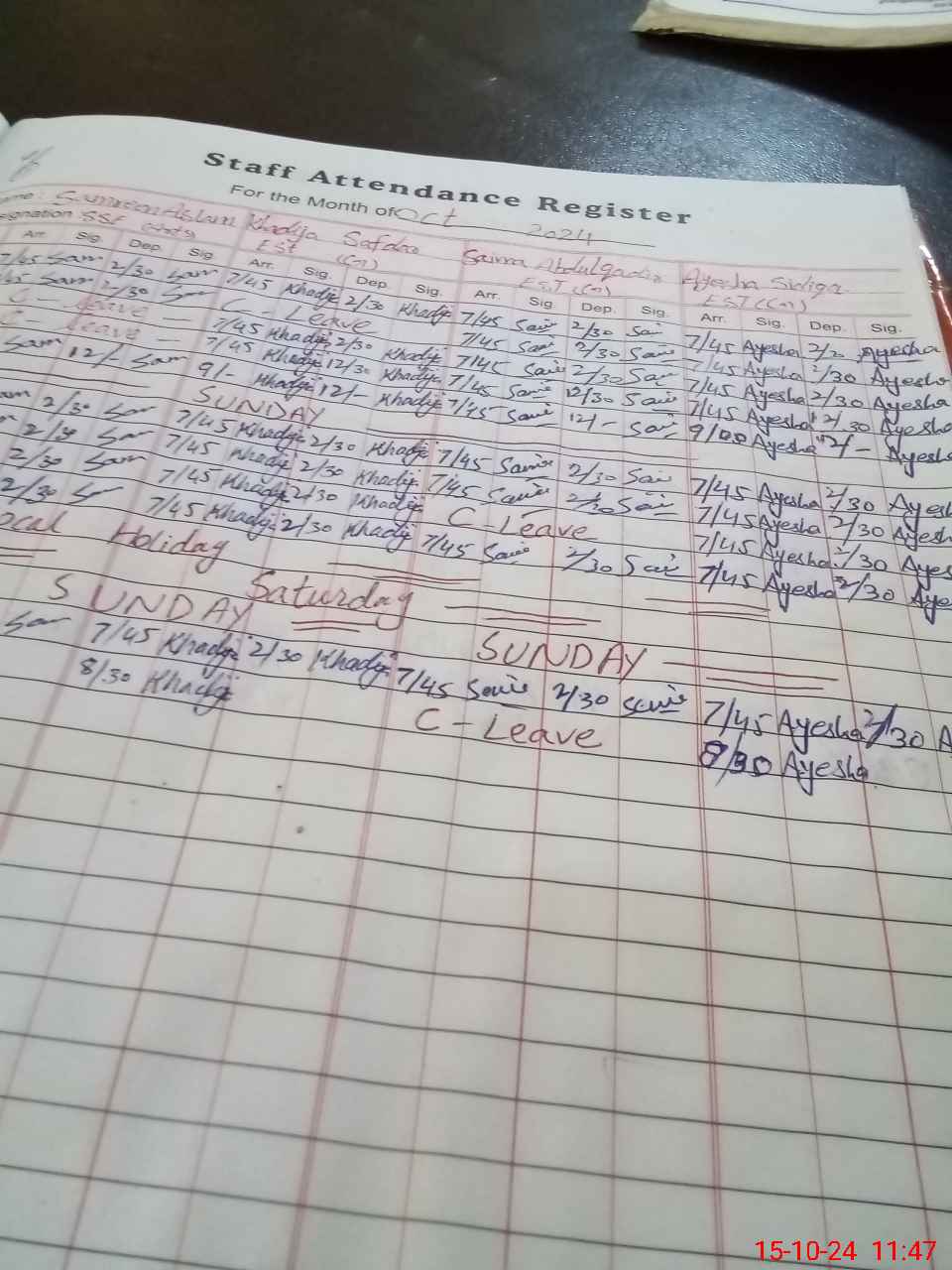 | Leave | Duty | Absent | Maternity | Medical | Ex- Pak |