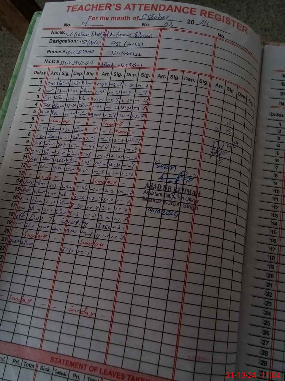 | CNIC | Full Name | Designation | R/C | Absence during last cal. month |