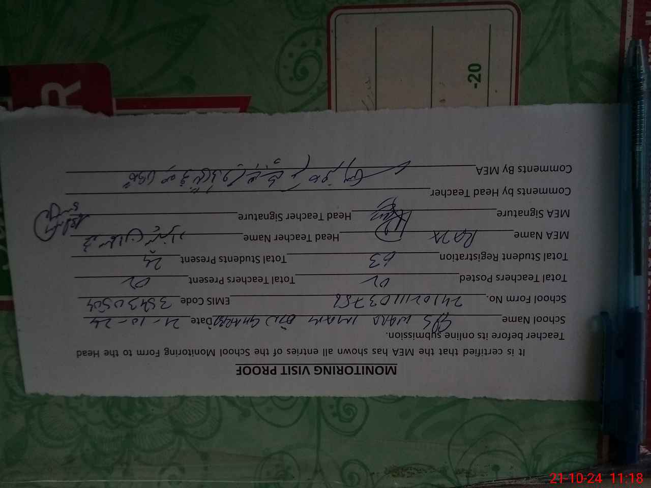 | Attendance Register | Head Teacher | MEA with School | Visit Proof |