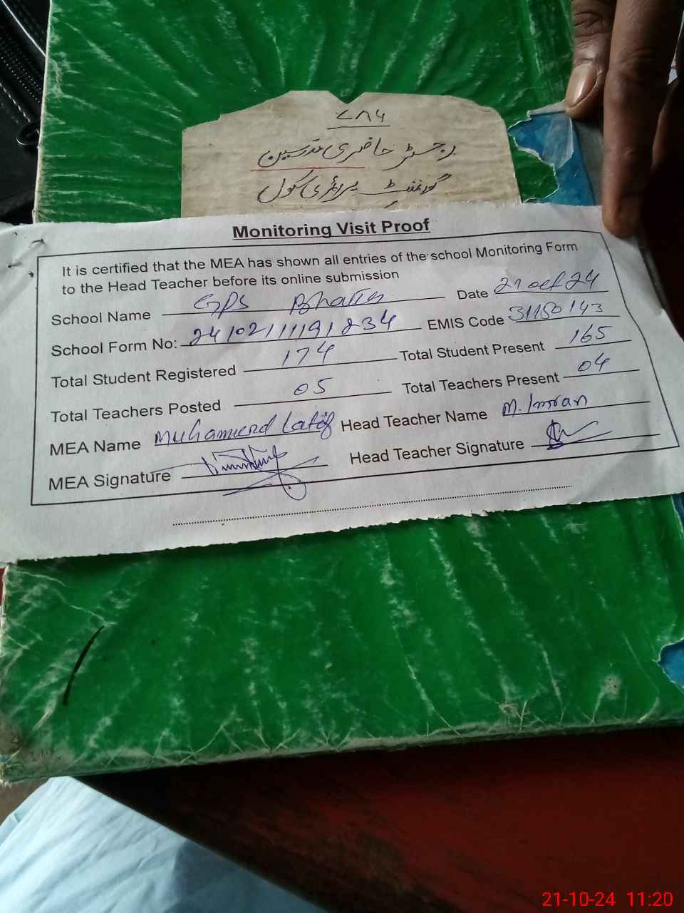 | Attendance Register | Head Teacher | MEA with School | Visit Proof |