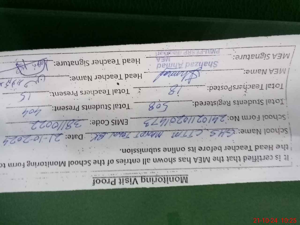 | Certified that this School was Inspected by the Undersigned MEA/DMO Today and the Information Stated Above is as Per Record. | |||||
