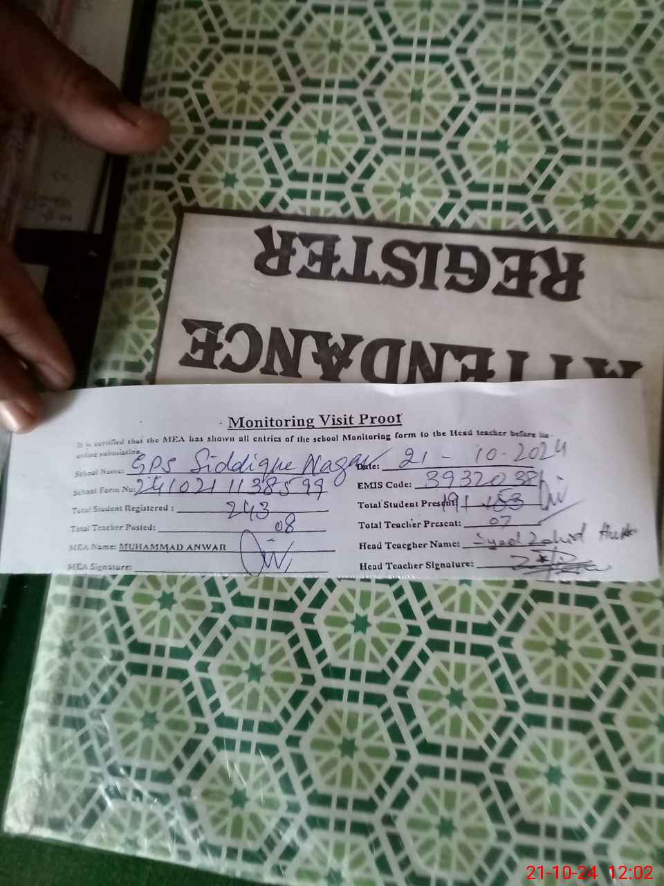 | Attendance Register | Head Teacher | MEA with School | Visit Proof |