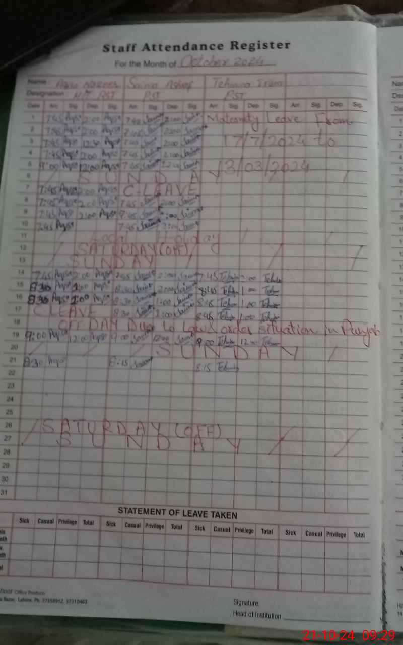 | Leave | Duty | Absent | Maternity | Medical | Ex- Pak |