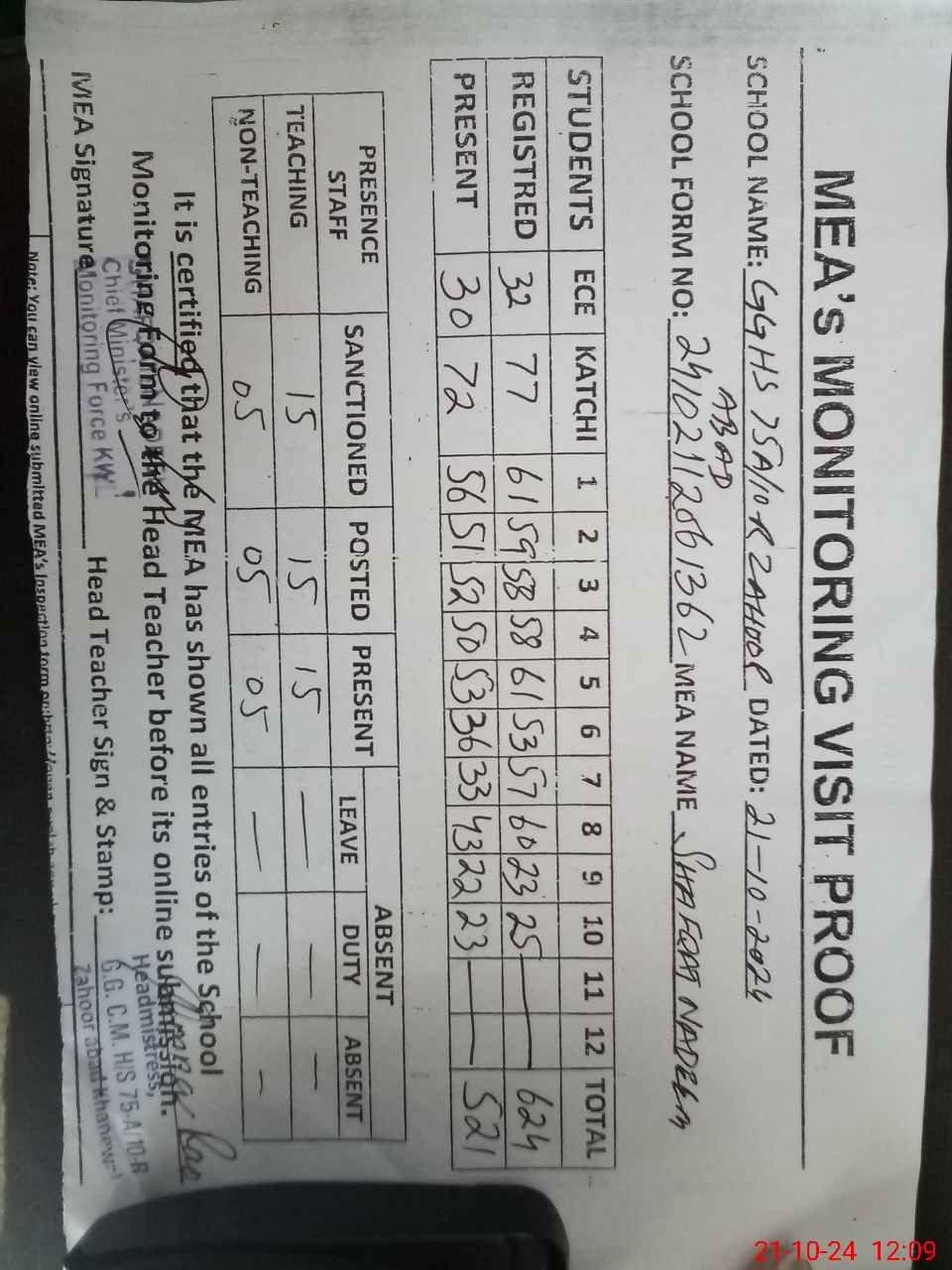 | Attendance Register | Head Teacher | MEA with School | Visit Proof |