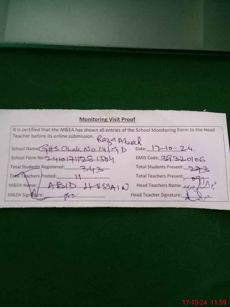 | Certified that this School was Inspected by the Undersigned MEA/DMO Today and the Information Stated Above is as Per Record. | |||||