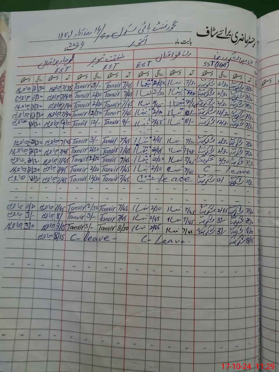 | CNIC | Full Name | Designation | R/C | Absence During Last Calender Month |