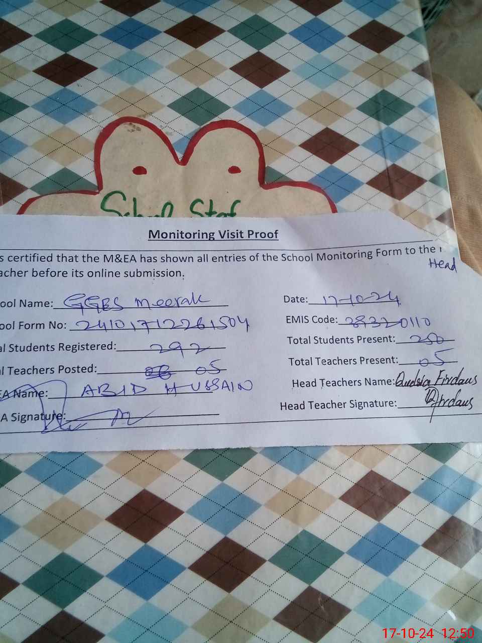 | Attendance Register | Head Teacher | MEA with School | Visit Proof |