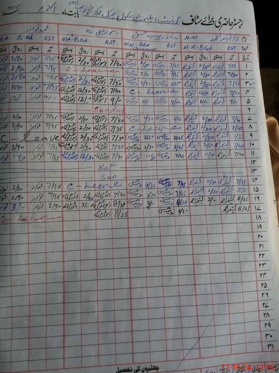 | CNIC | Full Name | Designation | R/C | Absence During Last Calender Month |