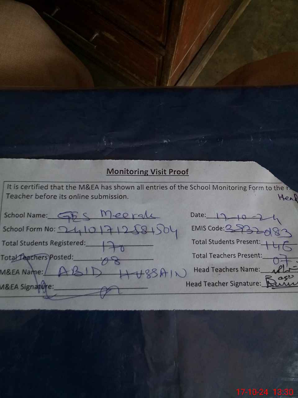 | Attendance Register | Head Teacher | MEA with School | Visit Proof |
