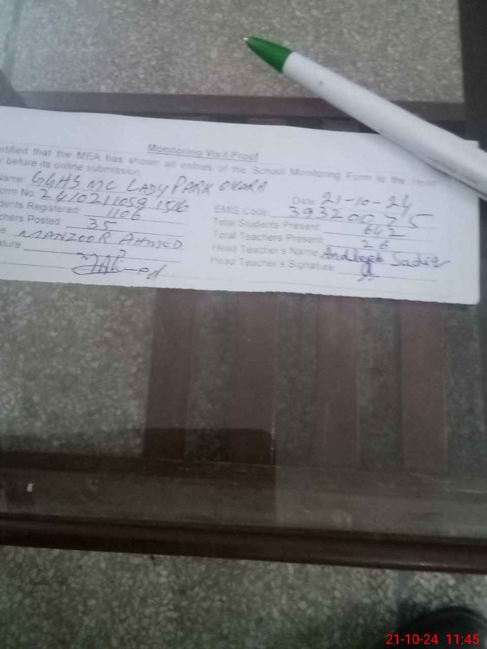 | Monitoring Date: 21-10-2024 | Start Time: 21-10-2024 10:58 AM | End Time: 21-10-2024 11:49 AM | Name of MEA: MA**** AH**** | |