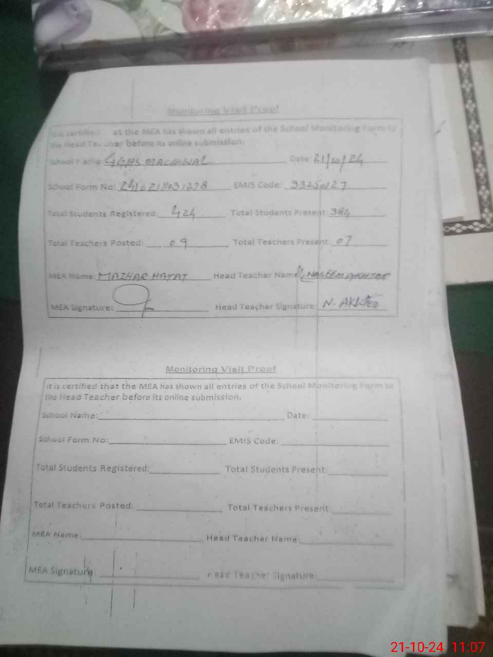 | Certified that this School was Inspected by the Undersigned MEA/DMO Today and the Information Stated Above is as Per Record. | |||||