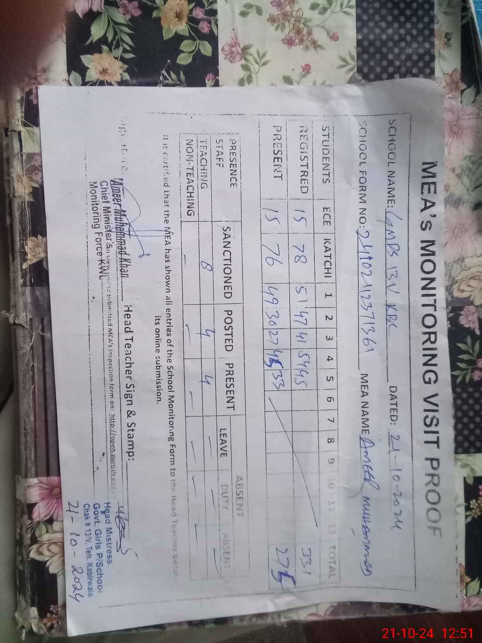 | EMIS Code: 36410346 | Name of School: GGPS 13/V, KABIRWALA | |||