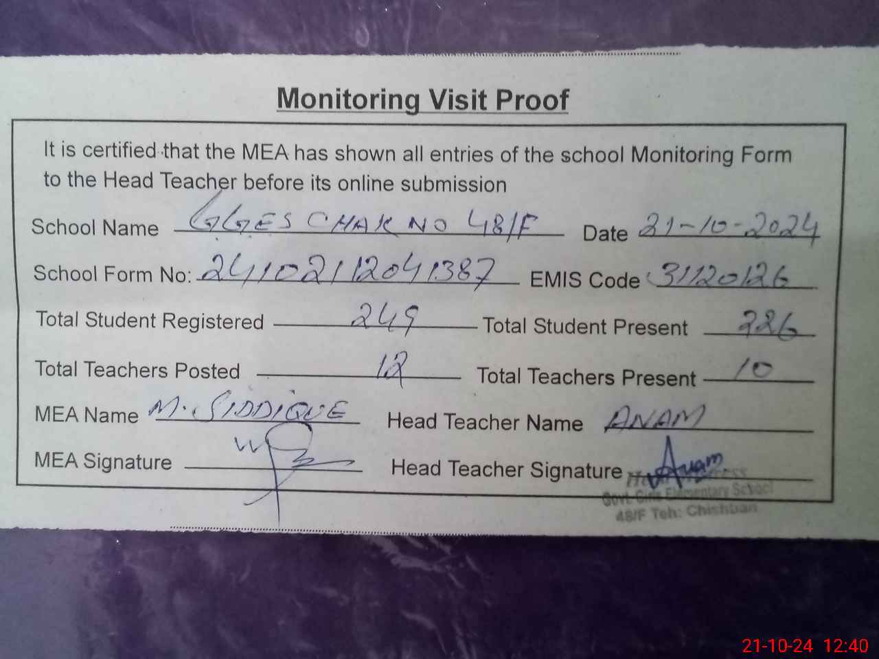 | Certified that this School was Inspected by the Undersigned MEA/DMO Today and the Information Stated Above is as Per Record. | |||||