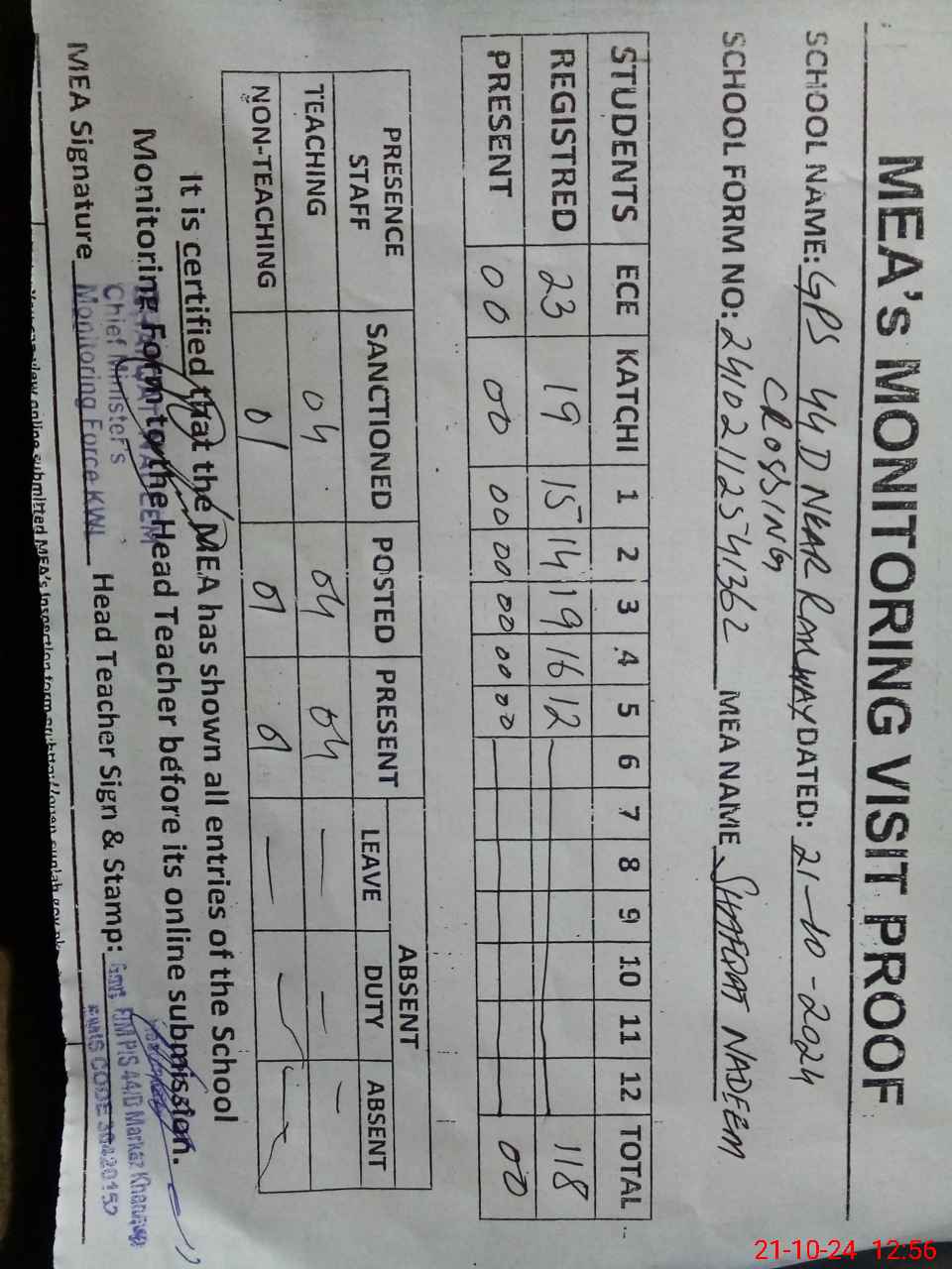| Attendance Register | Head Teacher | MEA with School | Visit Proof |