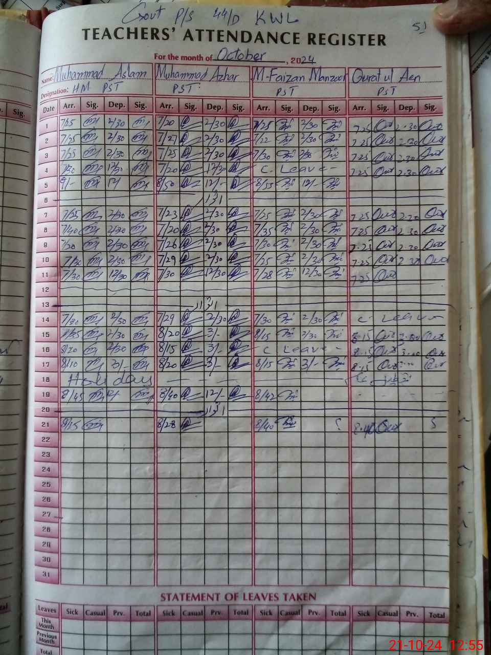 | Leave | Duty | Absent | Maternity | Medical | Ex- Pak |