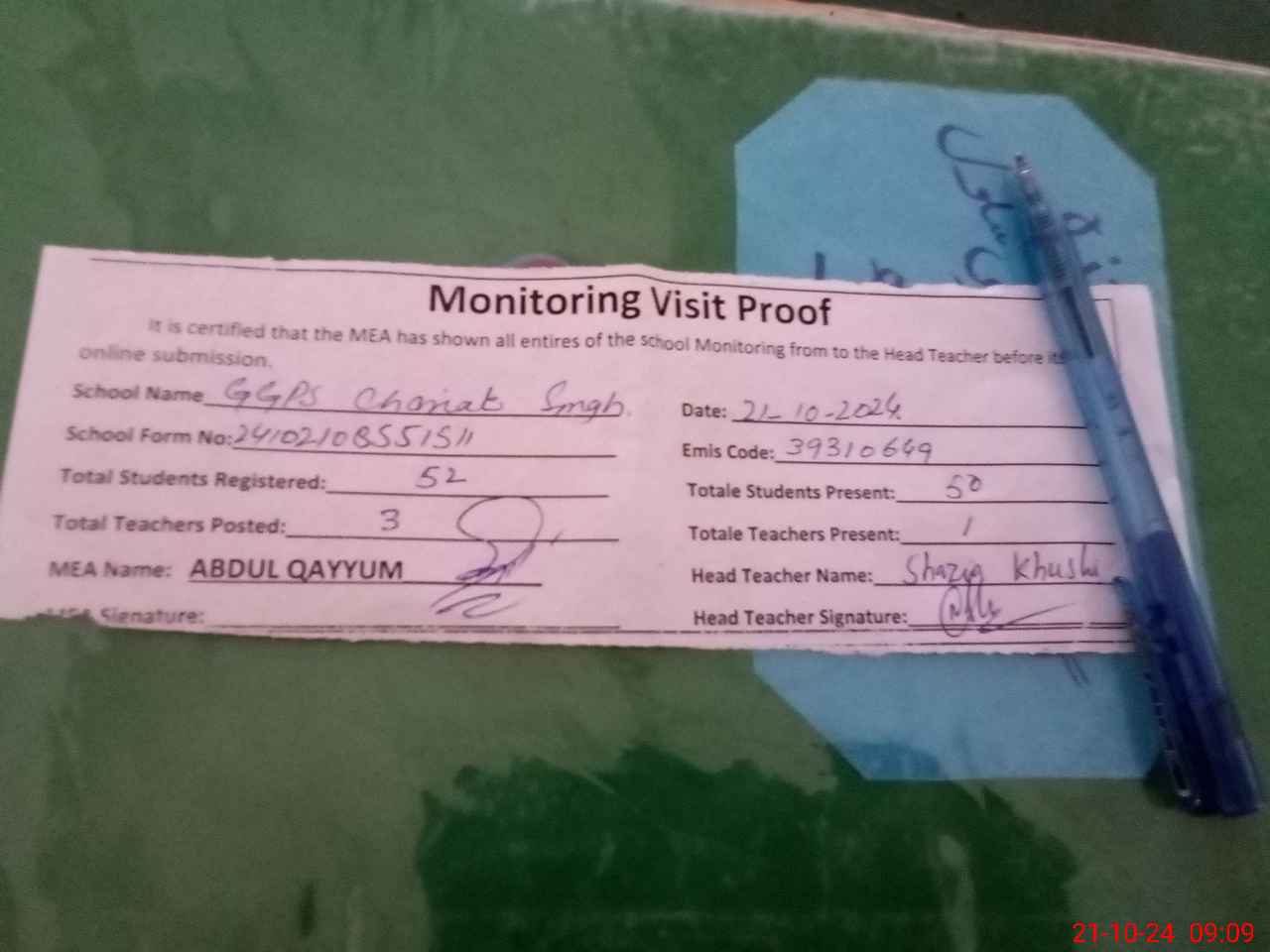 | Attendance Register | Head Teacher | MEA with School | Visit Proof |