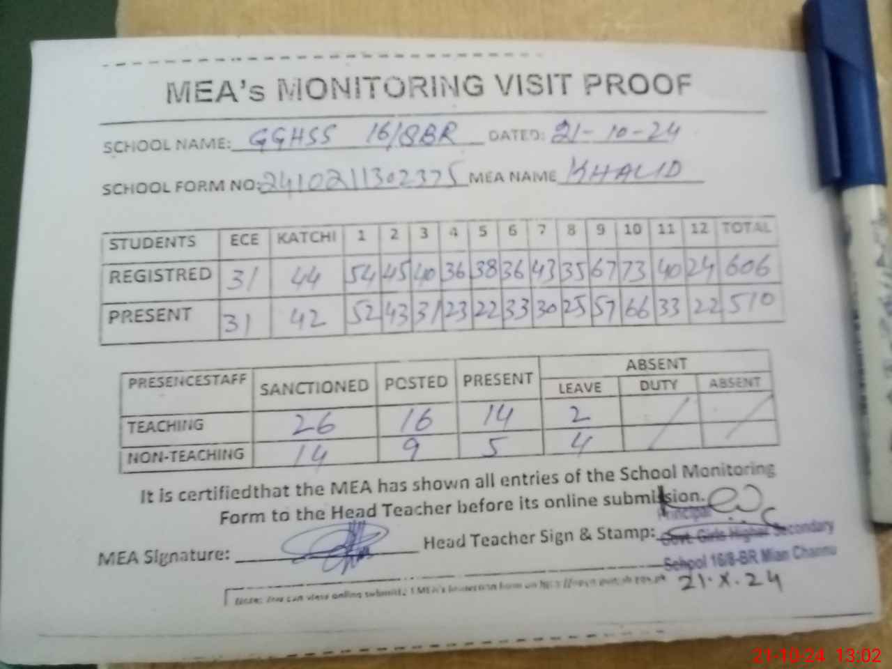 | Attendance Register | Head Teacher | MEA with School | Visit Proof |