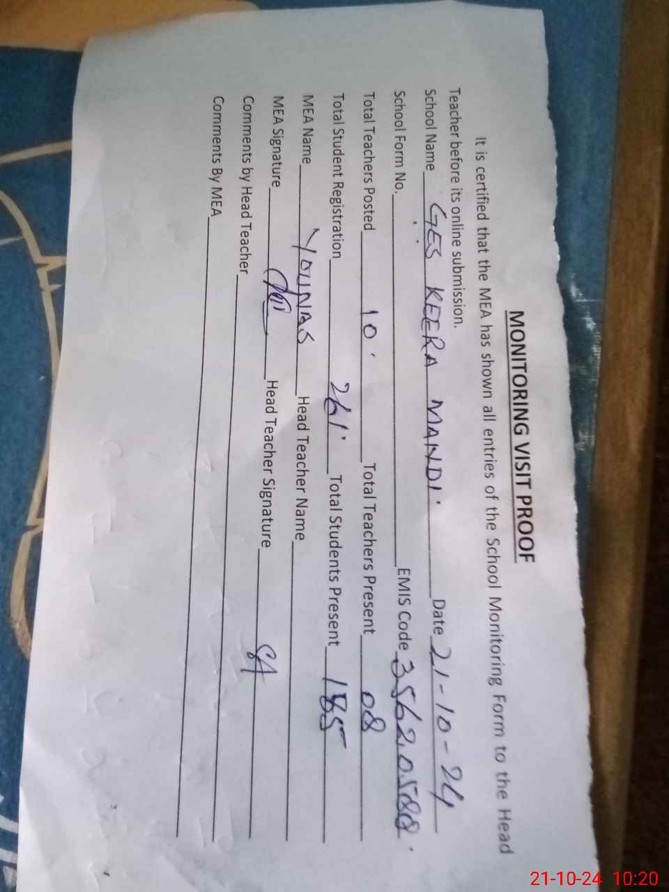 | Attendance Register | Head Teacher | MEA with School | Visit Proof |