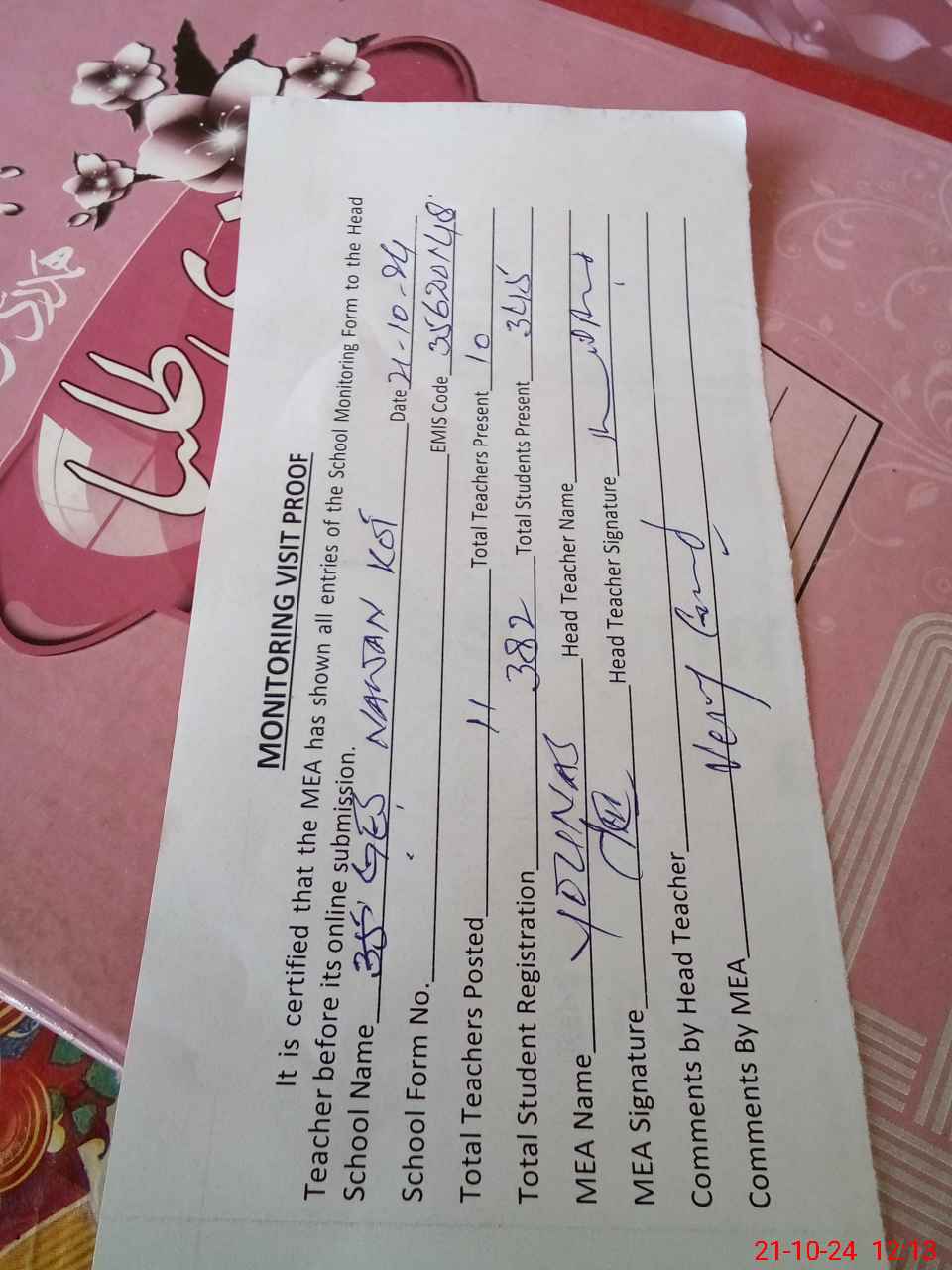 | Attendance Register | Head Teacher | MEA with School | Visit Proof |