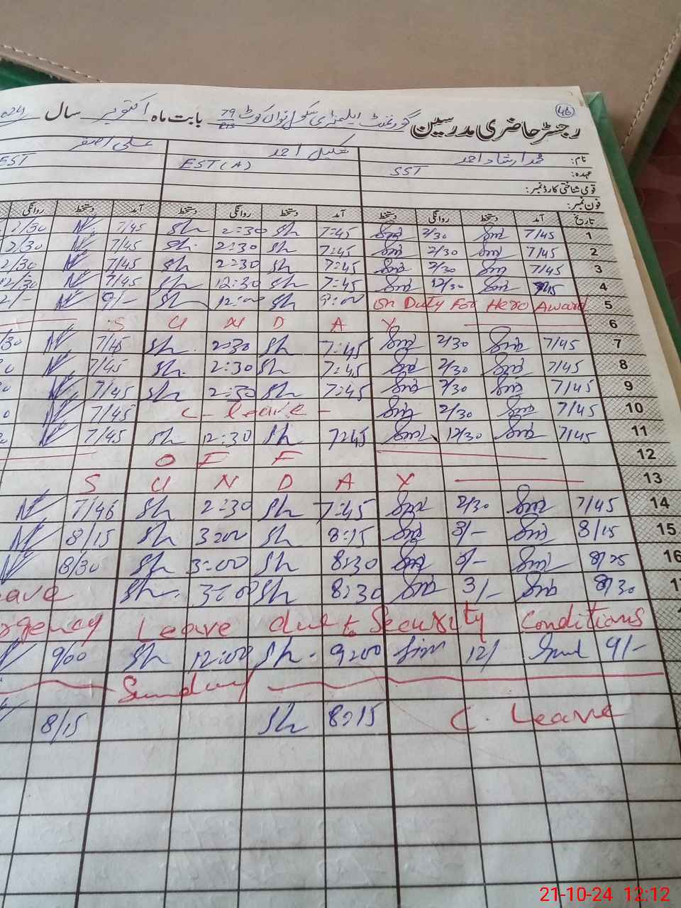| CNIC | Full Name | Designation | R/C | Absence During Last Calender Month |