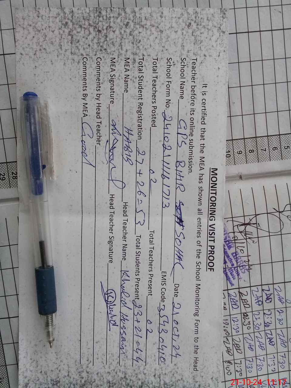| Attendance Register | Head Teacher | MEA with School | Visit Proof |