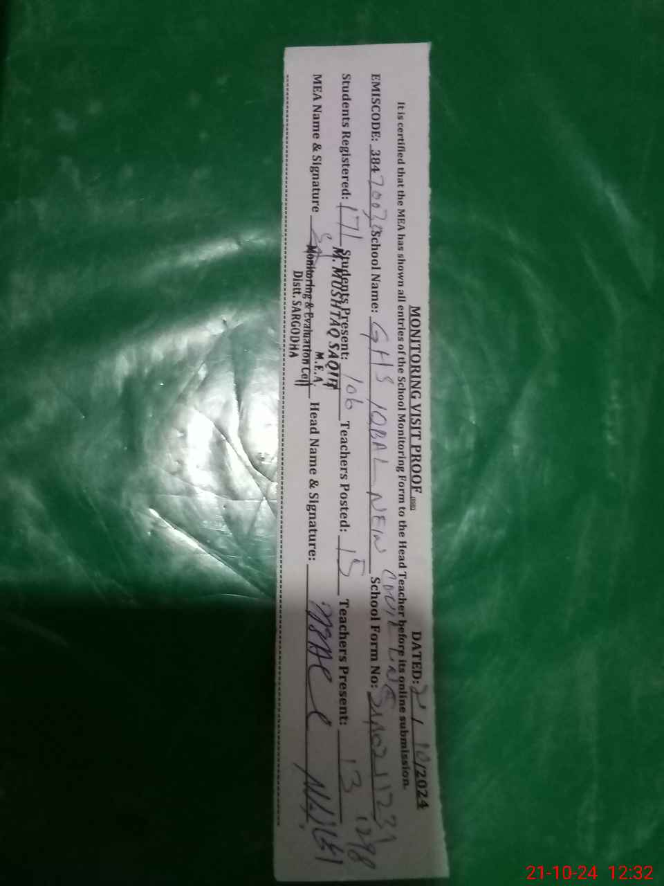 | EMIS Code: 38420030 | Name of School: GHS IQBAL NEW CIVIL LINE SARGODHA | |||